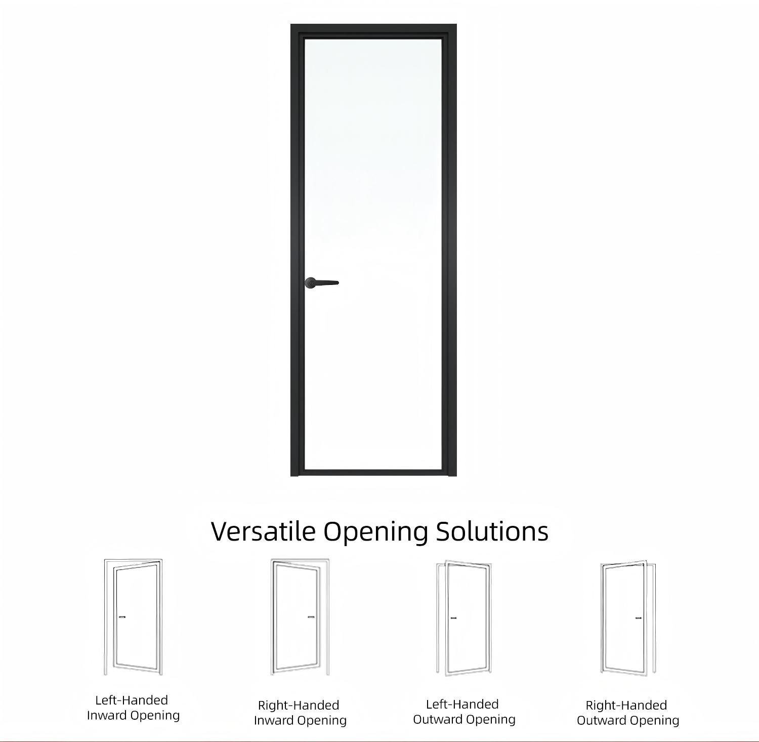 Esta requintada porta de vidro articulada utiliza vidro de segurança temperado de 6 mm como base padrão, proporcionando solidez excepcional e tranquilidade. Para atender às suas necessidades específicas de privacidade e design, oferecemos uma variedade de propriedades de vidro, incluindo vidro fosco clássico, vidro fosco canelado, vidro transparente e vidro canelado.