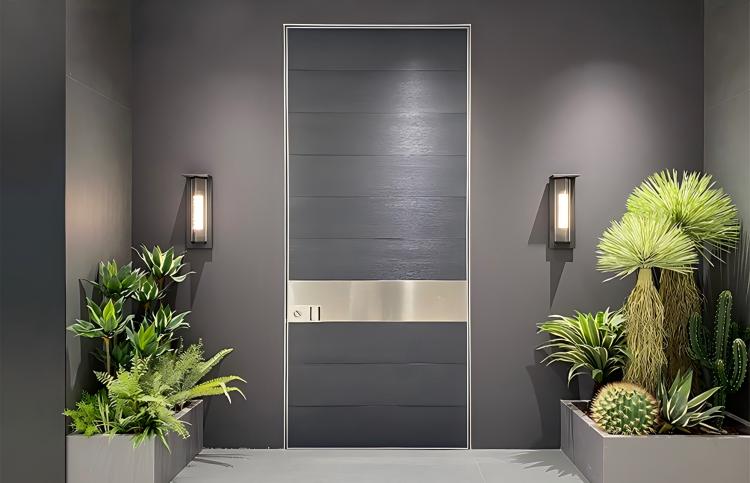 A personalização é a chave para o design de luxo. Esta sofisticada porta de entrada oferece duas configurações distintas de puxadores integrados à correia metálica. Escolha o puxador de bolso invisível e embutido para uma aparência minimalista e perfeitamente nivelada ou opte pela barra de apoio horizontal sólida e proeminente para uma declaração ousada e tátil.