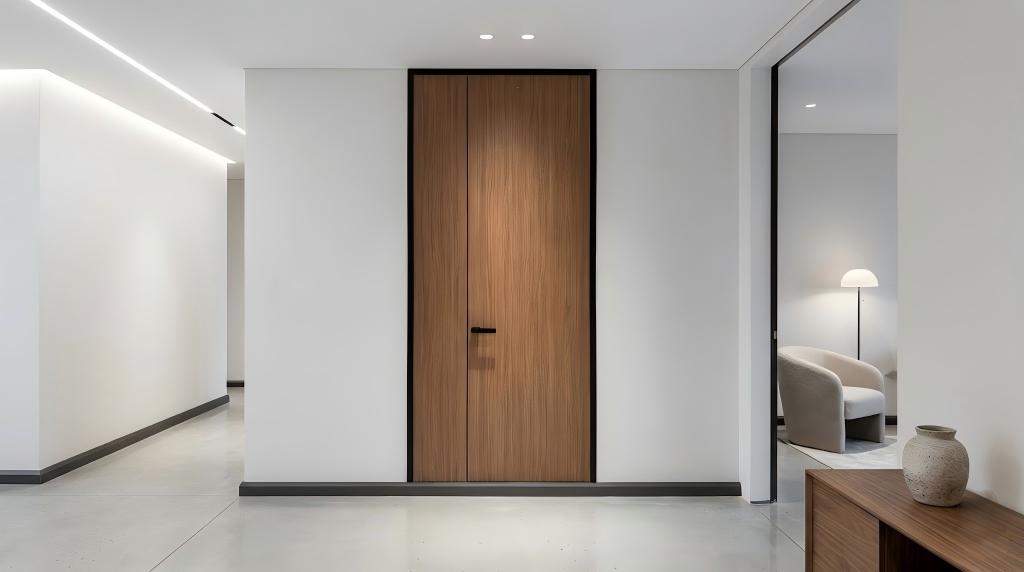 Redefinindo o luxo interior, a coleção híbrida Série Alumínio-Madeira combina magistralmente a textura orgânica e convidativa da madeira com a durabilidade intransigente de uma estrutura metálica de nível aeroespacial. Elevando o conceito de uma laje de porta de madeira maciça premium, este design híbrido foi projetado para oferecer o máximo de privacidade, isolamento acústico excepcional e elegância tátil em suítes master e executivas. É um testemunho da arquitectura moderna e minimalista, oferecendo um contraste visual impressionante entre a sua moldura elegante em preto mate e as superfícies granuladas naturais e quentes.